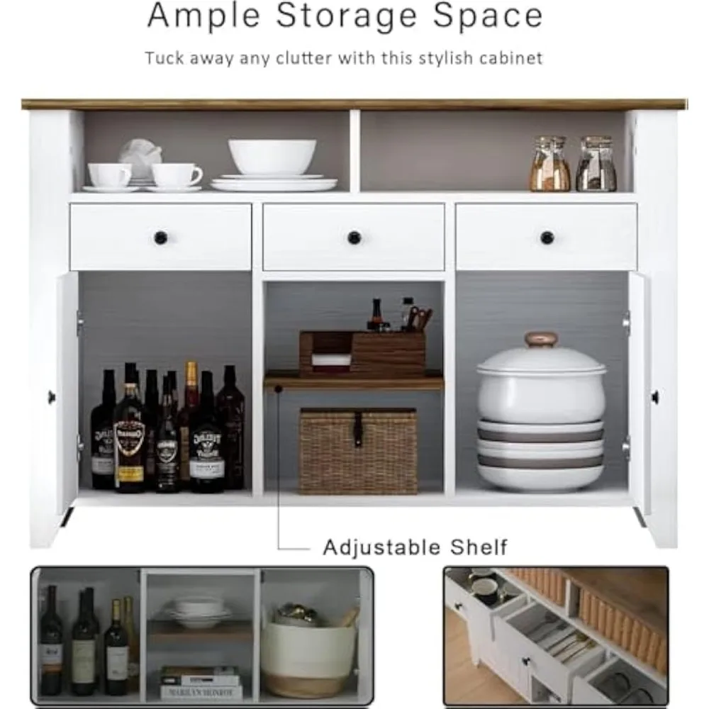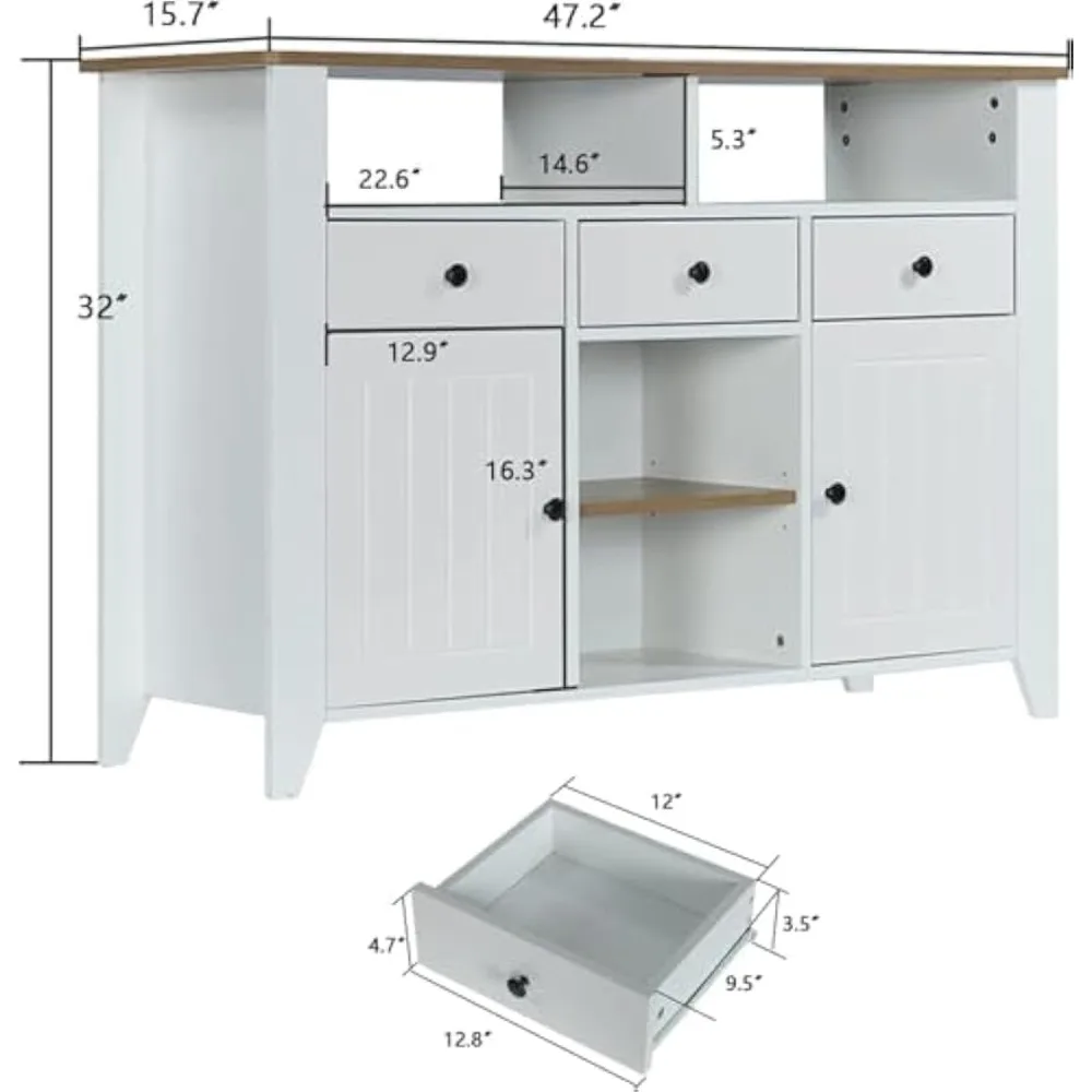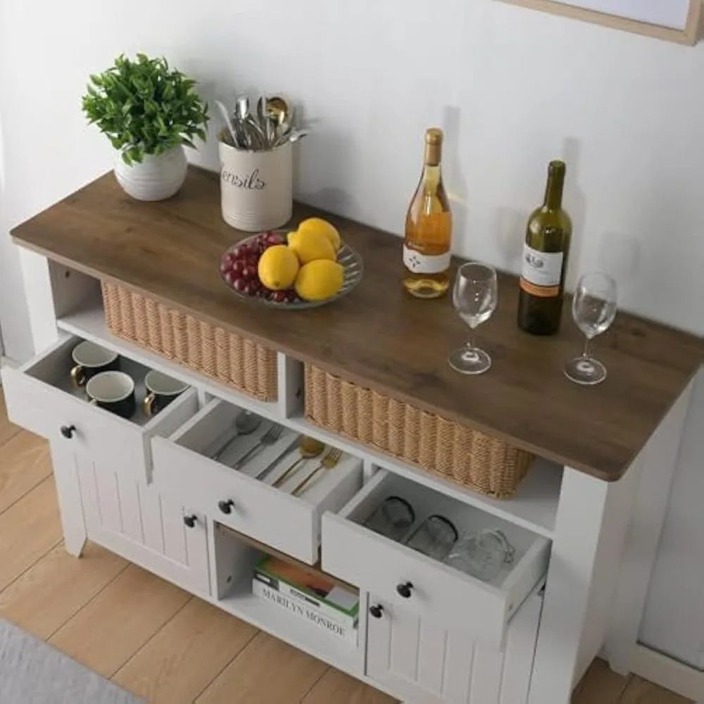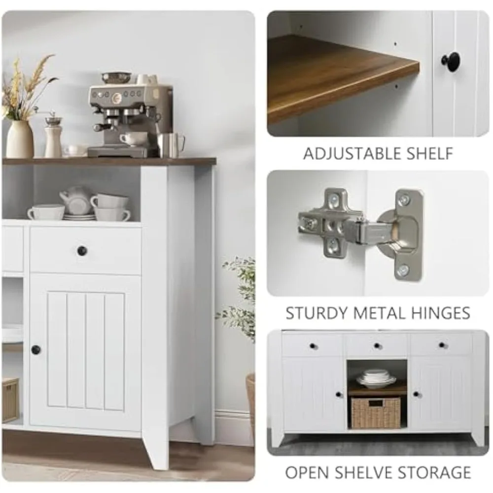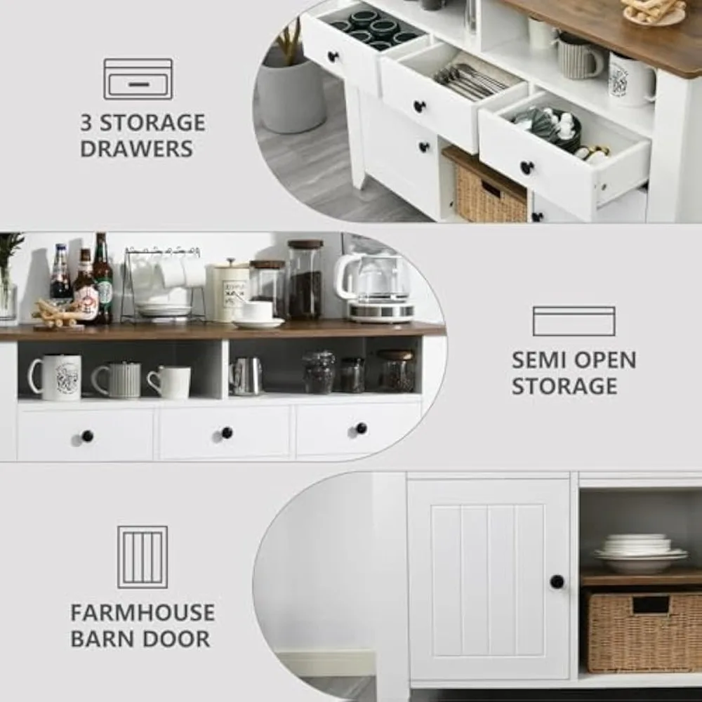 Bring charm and convenience to your kitchen or dining area with this 47″ Farmhouse Coffee Bar Cabinet. Featuring a crisp white finish and rustic accents, it includes 3 smooth-gliding drawers, 2 closed-door cabinets, and an open shelf perfect for mugs, décor, or your favorite coffee essentials. Whether used as a coffee station, sideboard, or buffet table, this piece offers stylish, functional storage that enhances any farmhouse or modern home décor.