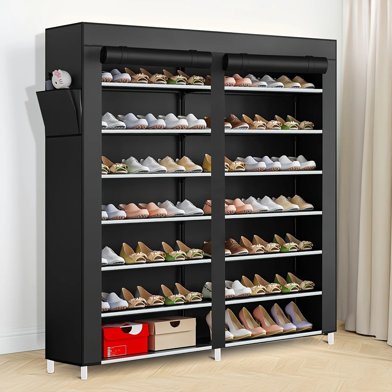 Keep your footwear neatly stored and protected with the 6-Layer Double Row Shoe Rack with Dust Cover. Designed with 12 spacious grids, this rack provides ample room to organize sneakers, heels, boots, and everyday shoes in one compact structure. The double row design maximizes storage capacity while keeping your shoes accessible and visible. Made from durable black plastic, it offers a sturdy yet lightweight build that fits perfectly into bedrooms, closets, entryways, or dorm rooms. The included dustproof cover keeps your shoes clean, safe from moisture, and free from dirt, ensuring they stay in top condition. Easy to assemble and disassemble, this rack requires no complicated tools, making it convenient for moving or reorganization. Its sleek, modern look blends seamlessly with any décor style while providing practical storage. Great for families or individuals with growing shoe collections, this rack helps save space and maintain tidiness. The vertical 6-layer design ensures efficient use of floor space while offering plenty of storage. With its functional, durable, and stylish design, this shoe rack is an essential addition to any organized home.