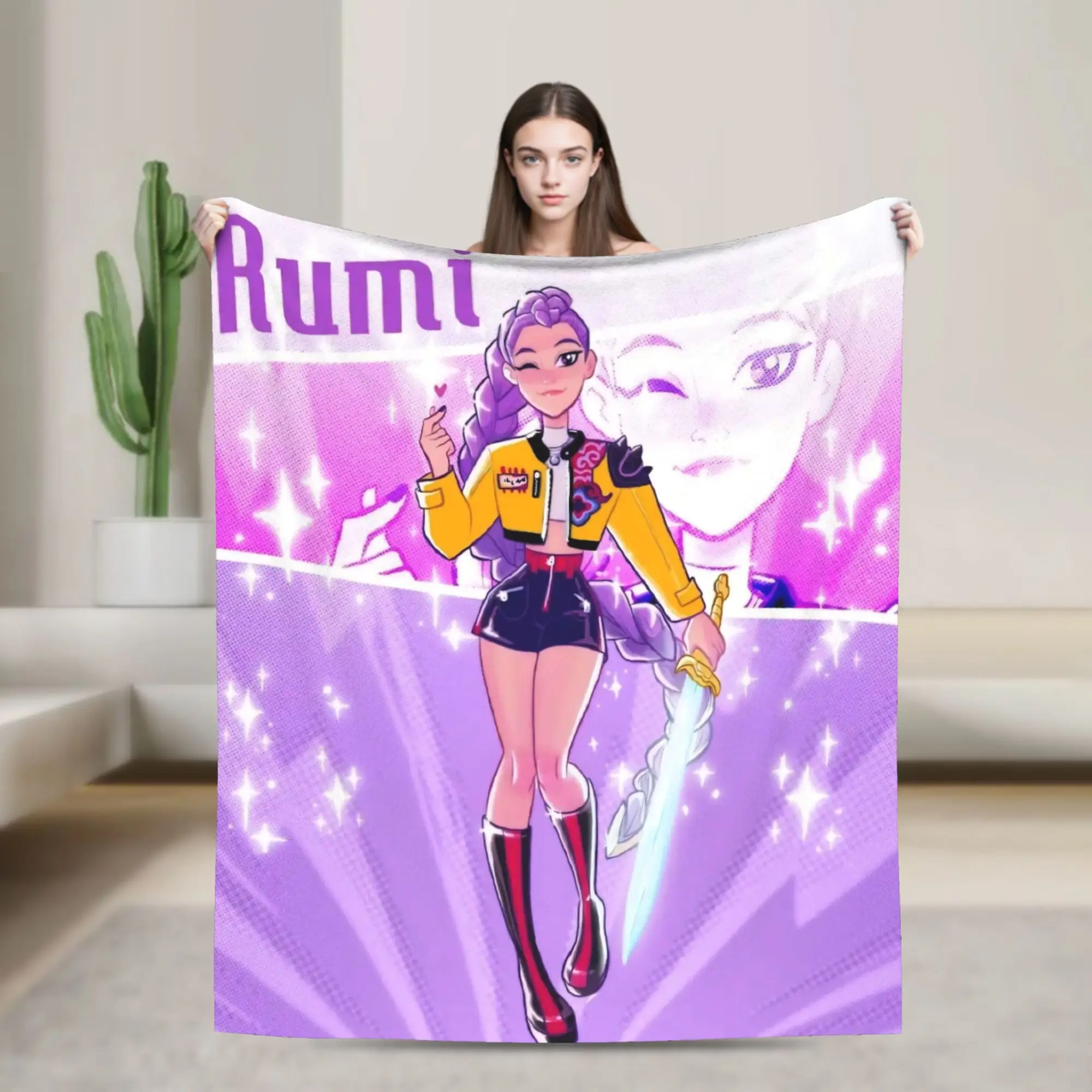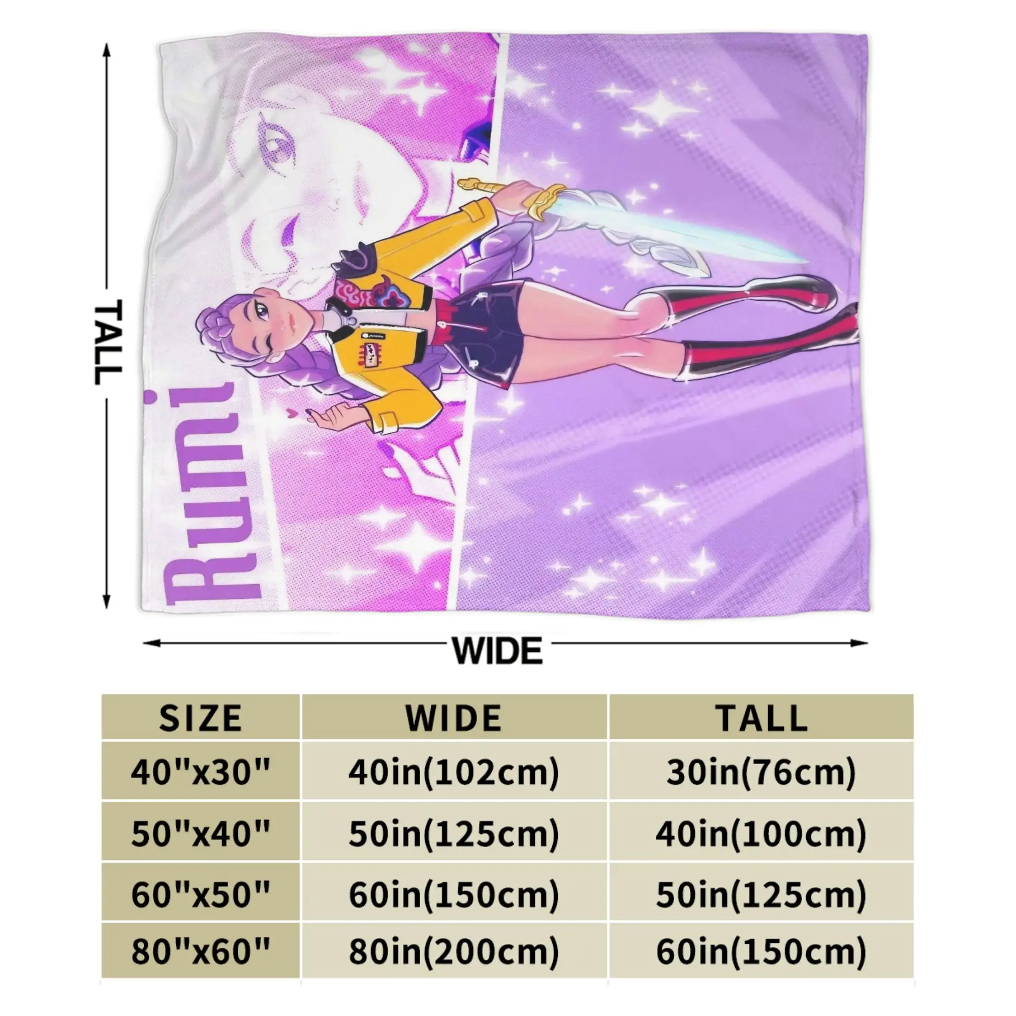 Wrap yourself in cozy comfort with the Rumi K-Pop Demon Hunters Blanket, designed for fans who love bold character style and premium warmth. This ultra-soft throw features vibrant, high-quality printing that brings your favorite Demon Hunters character to life. Made from plush, breathable fabric, it delivers incredible warmth without feeling heavy – perfect for movie nights, or just everyday lounging. Use it as a couch throw, bedspread, or decorative blanket for a child’s room. The durable stitching ensures long-lasting softness and color retention after multiple washes. It’s ideal for both kids and adults. This versatile blanket adds fun and style to any space. Give your space a K-Pop of personality with this warm and stylish Demon Hunters blanket from Essential Living Store.