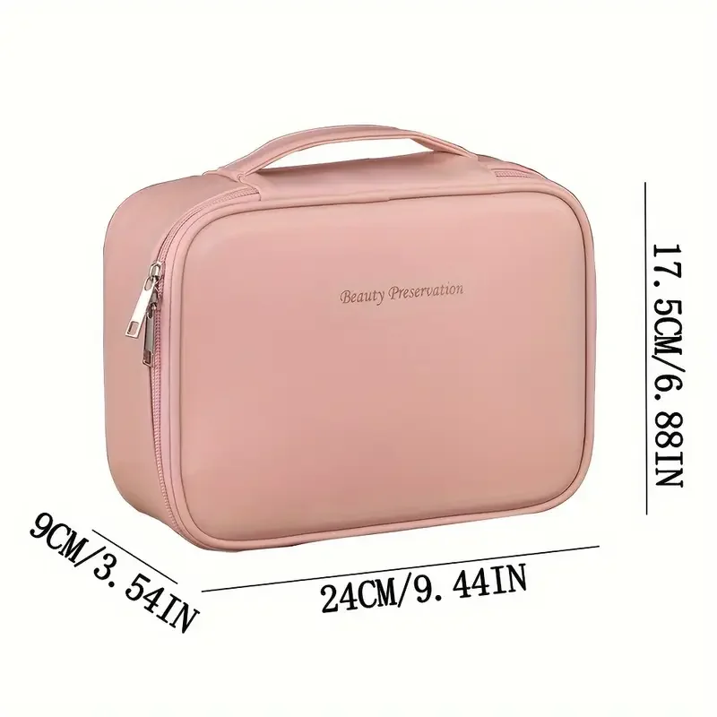 Stay organized and stylish on the go with the Large Waterproof Cosmetic Bag. Designed for travelers and beauty lovers alike, this PU leather makeup organizer combines elegance with functionality. Its large capacity allows you to store all your essentials—makeup, skincare, brushes, and toiletries—in one convenient place. The built-in divider system helps keep your items neatly arranged and easy to find, preventing spills and clutter. Made from high-quality waterproof PU material, it protects your cosmetics from moisture and leaks, making it perfect for travel or daily use. The durable handle and secure zipper closure ensure easy portability and peace of mind wherever you go. With its sleek, modern design, this bag doubles as a chic accessory for any occasion. Ideal for use at home, in hotels, or on the road, it’s both functional and fashionable. Whether you’re packing for a weekend getaway or organizing your vanity, the Large Waterproof Cosmetic Bag keeps your essentials safe, tidy, and ready for use. Enjoy effortless beauty organization with this stylish travel companion.